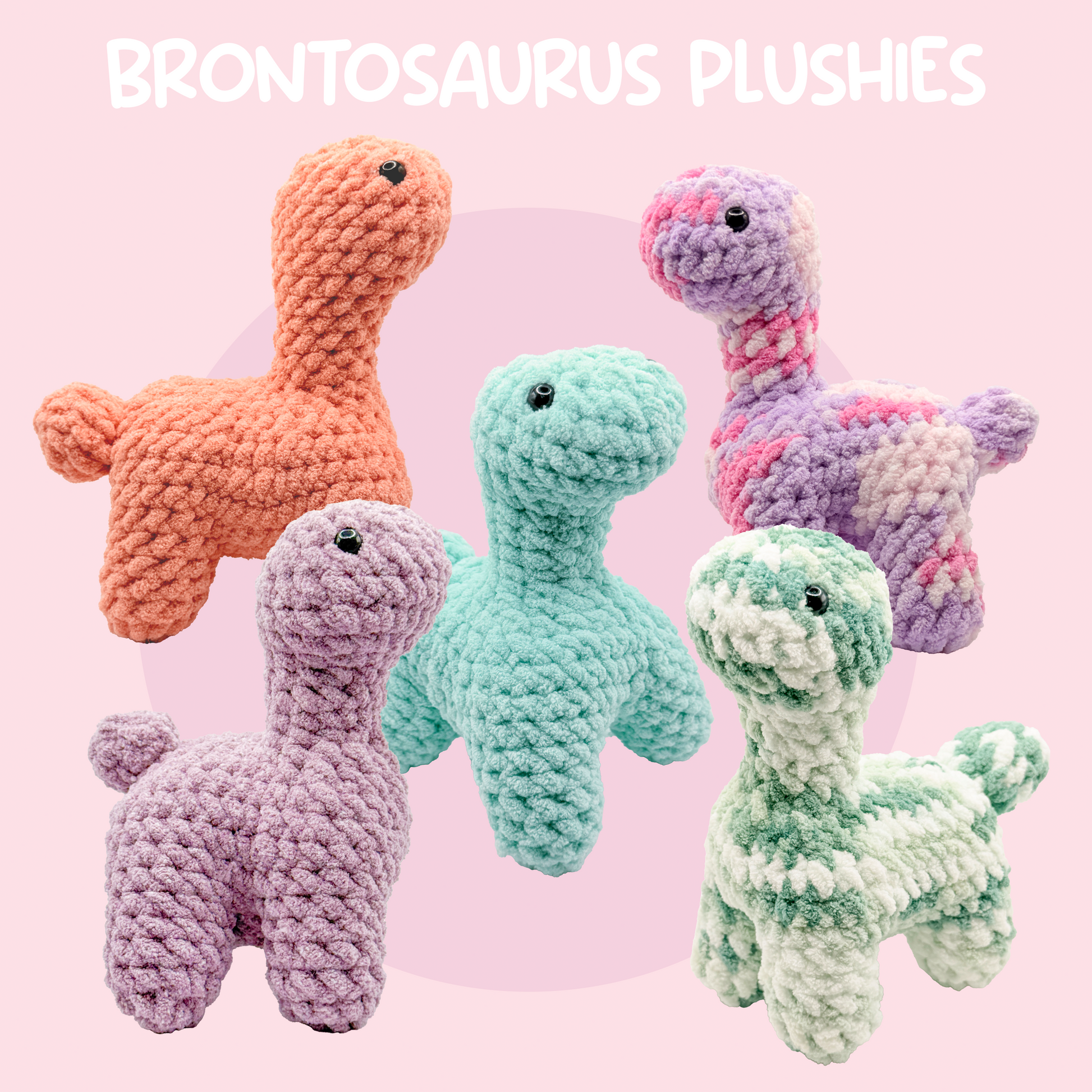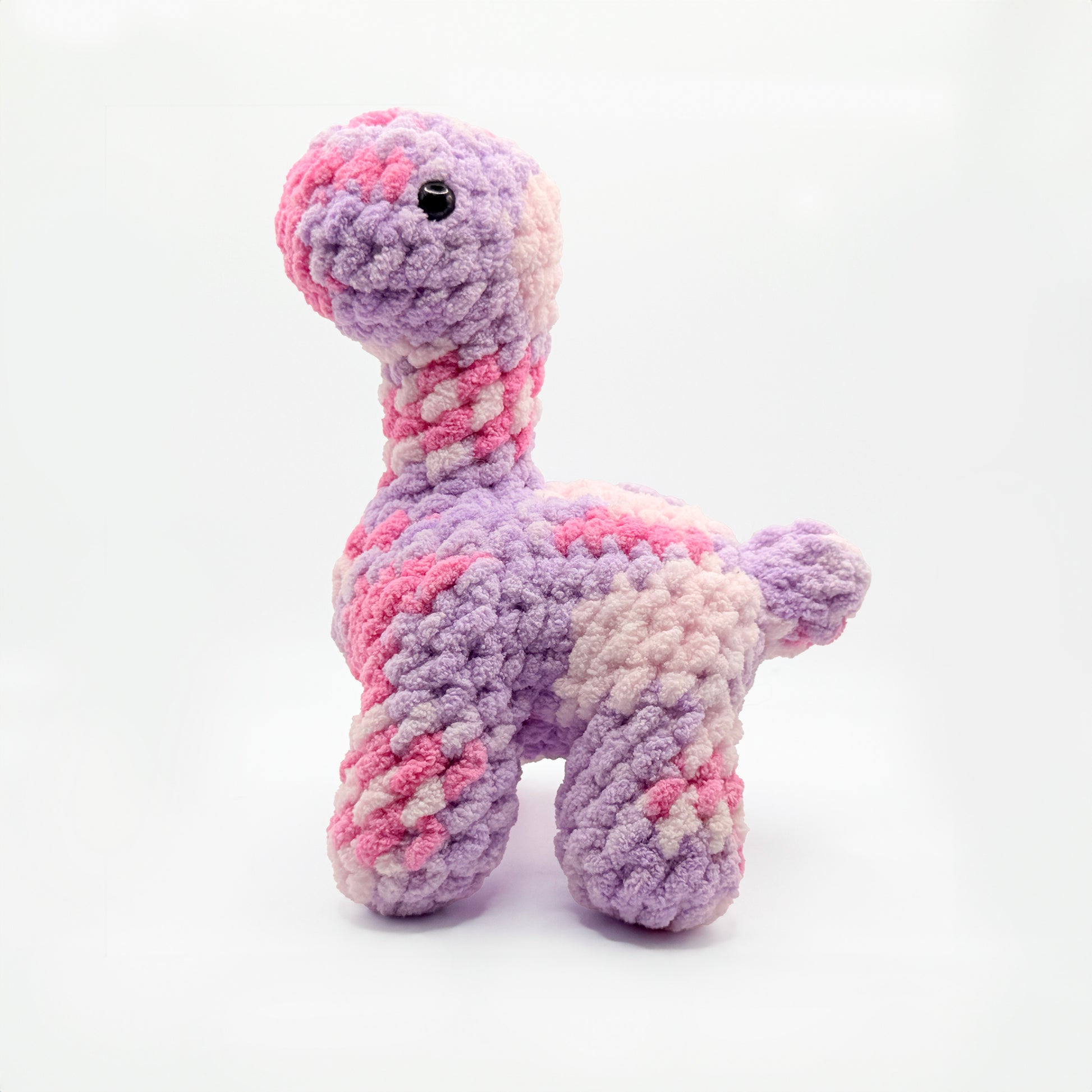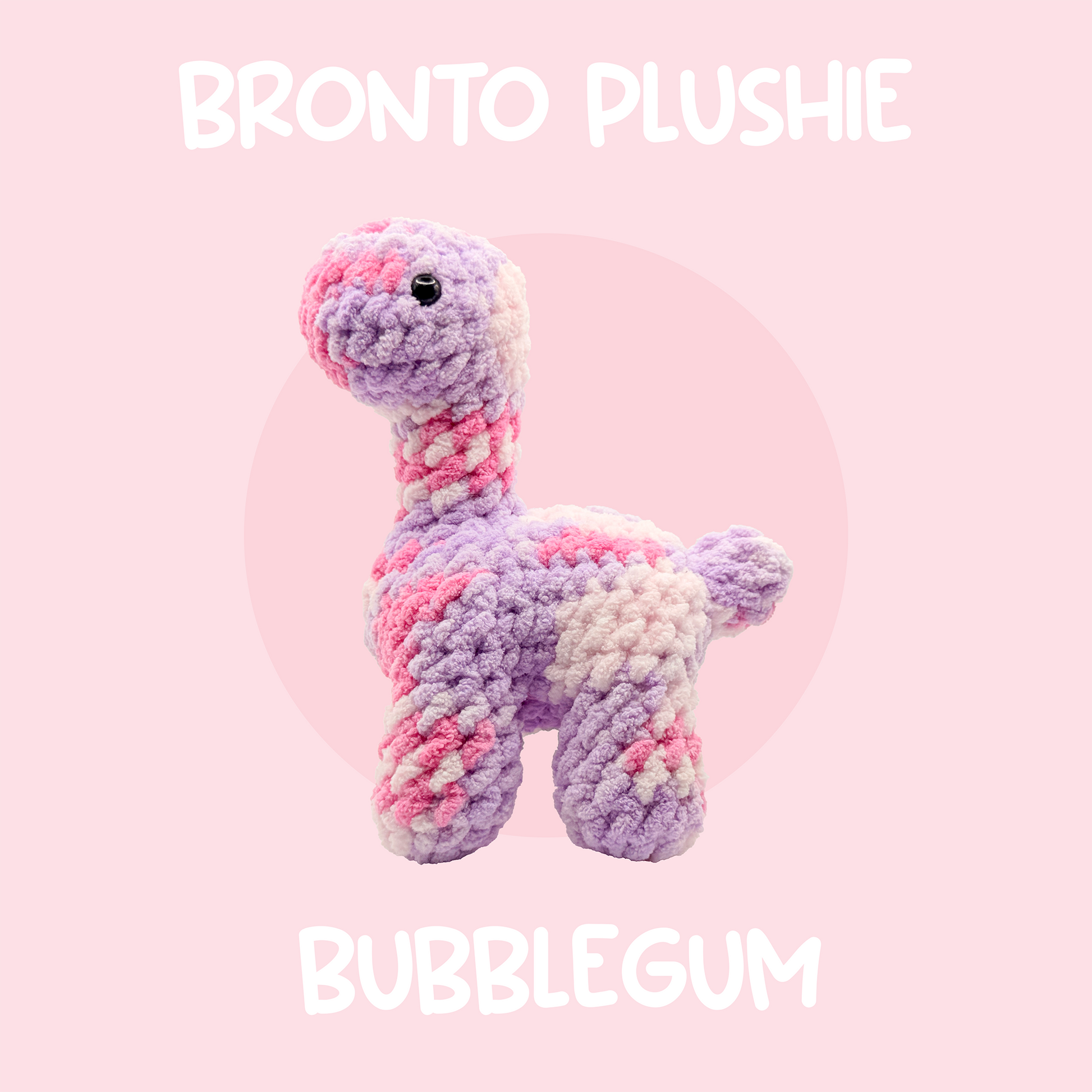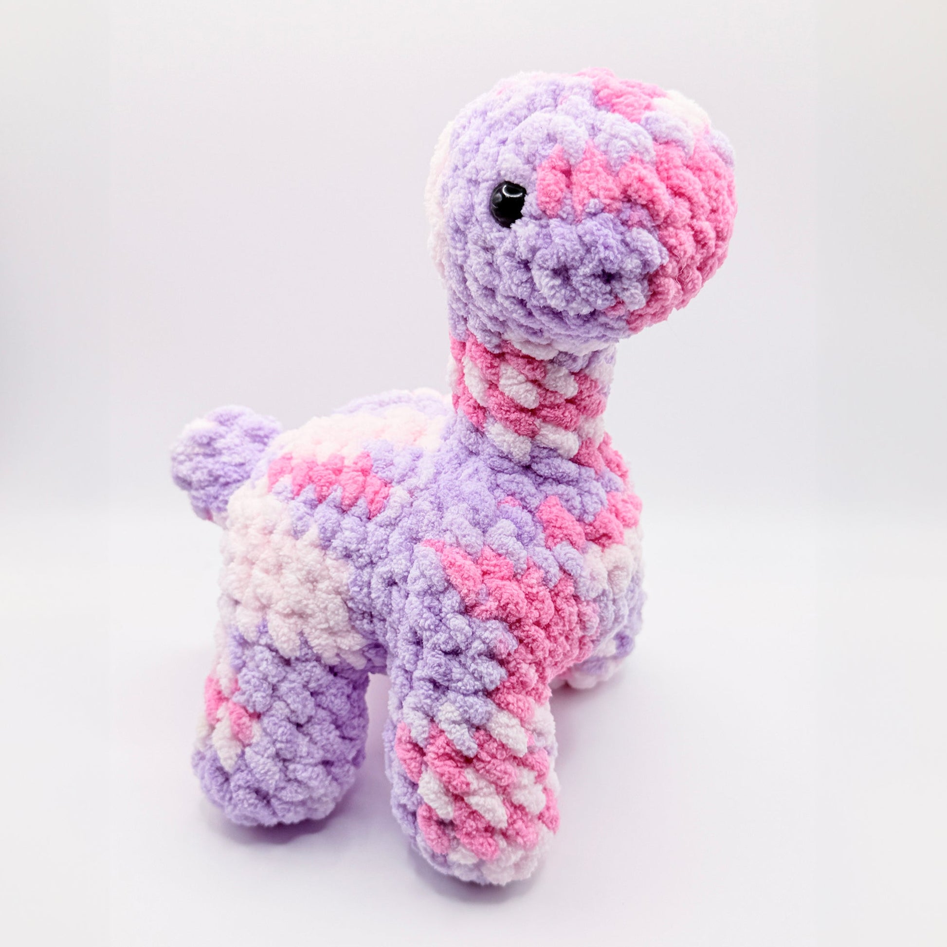 One cute small bubblegum colored bronto plushie. Crocheted by me!