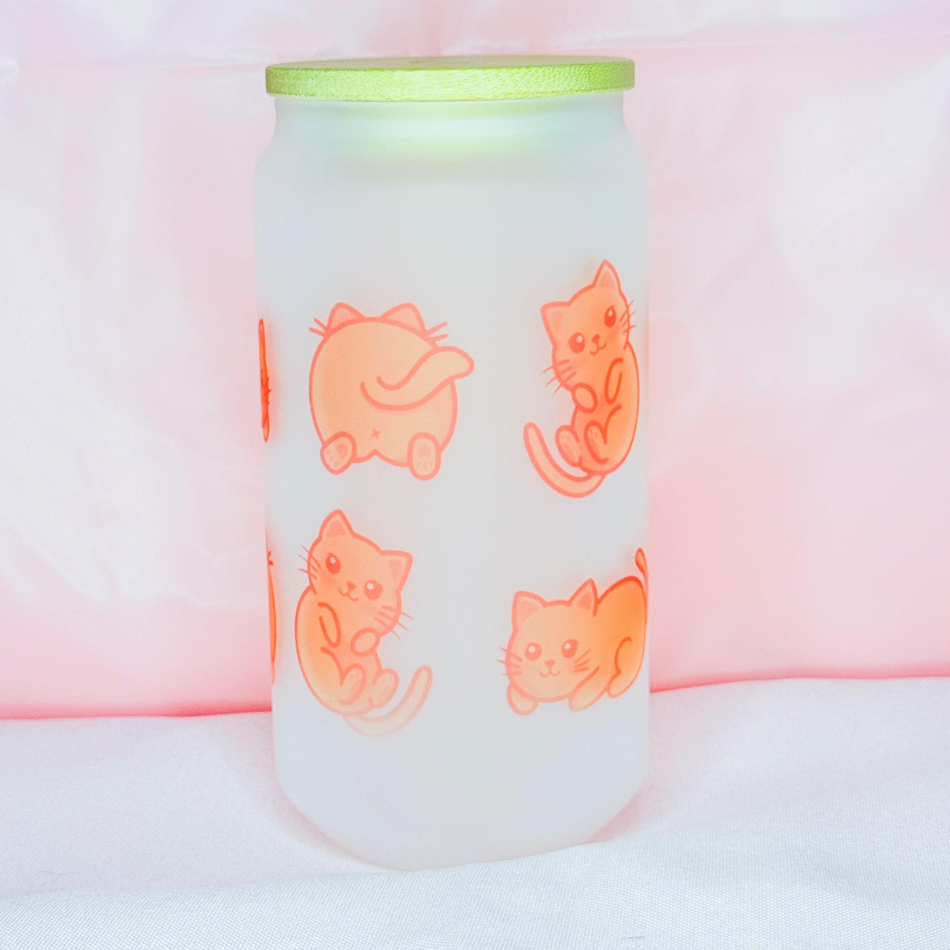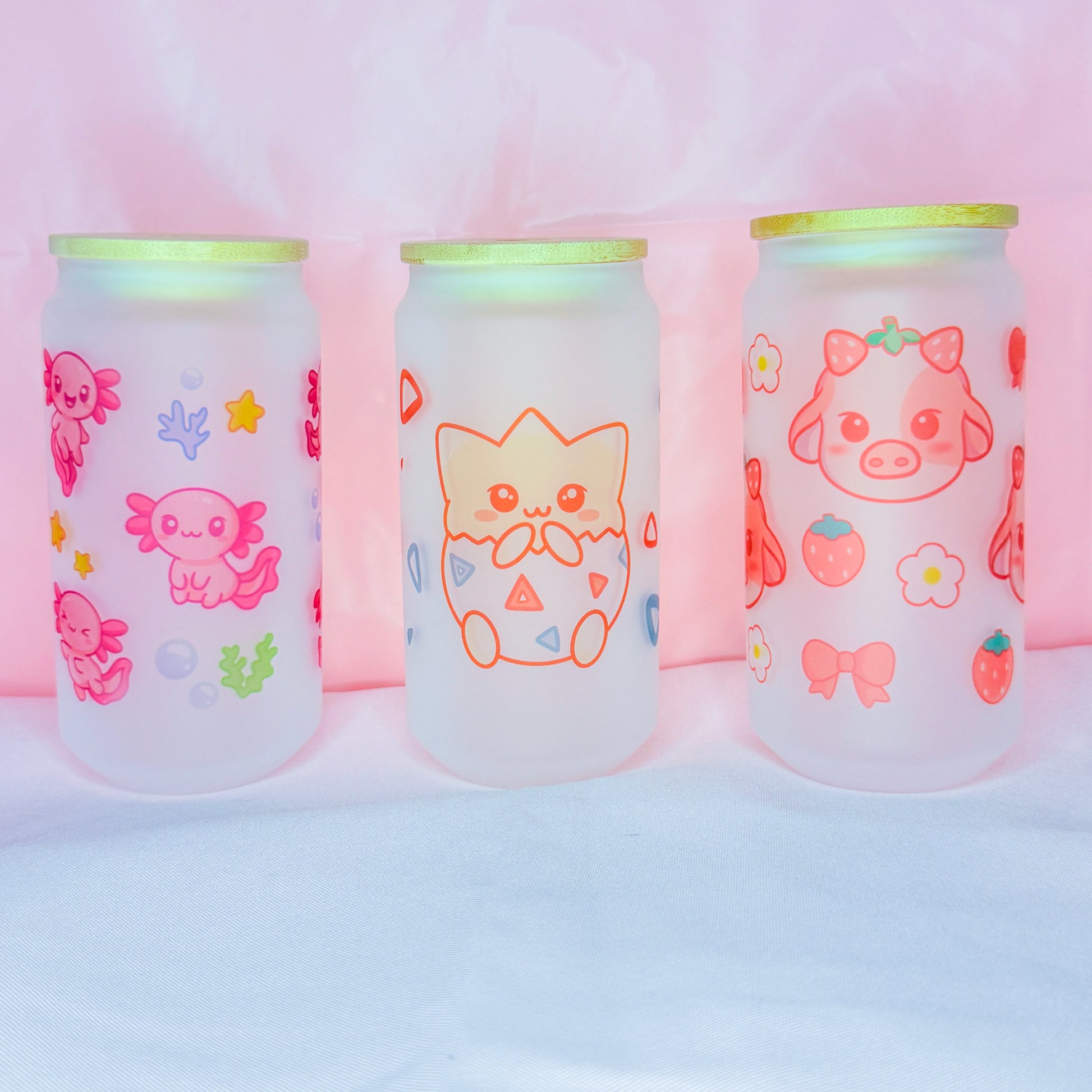 Each glass cup has a cute design, drawn and heat pressed by me! Includes a bamboo lid and glass straw. Can be used for iced coffee, iced tea, juice, milk, or any other drinks!
