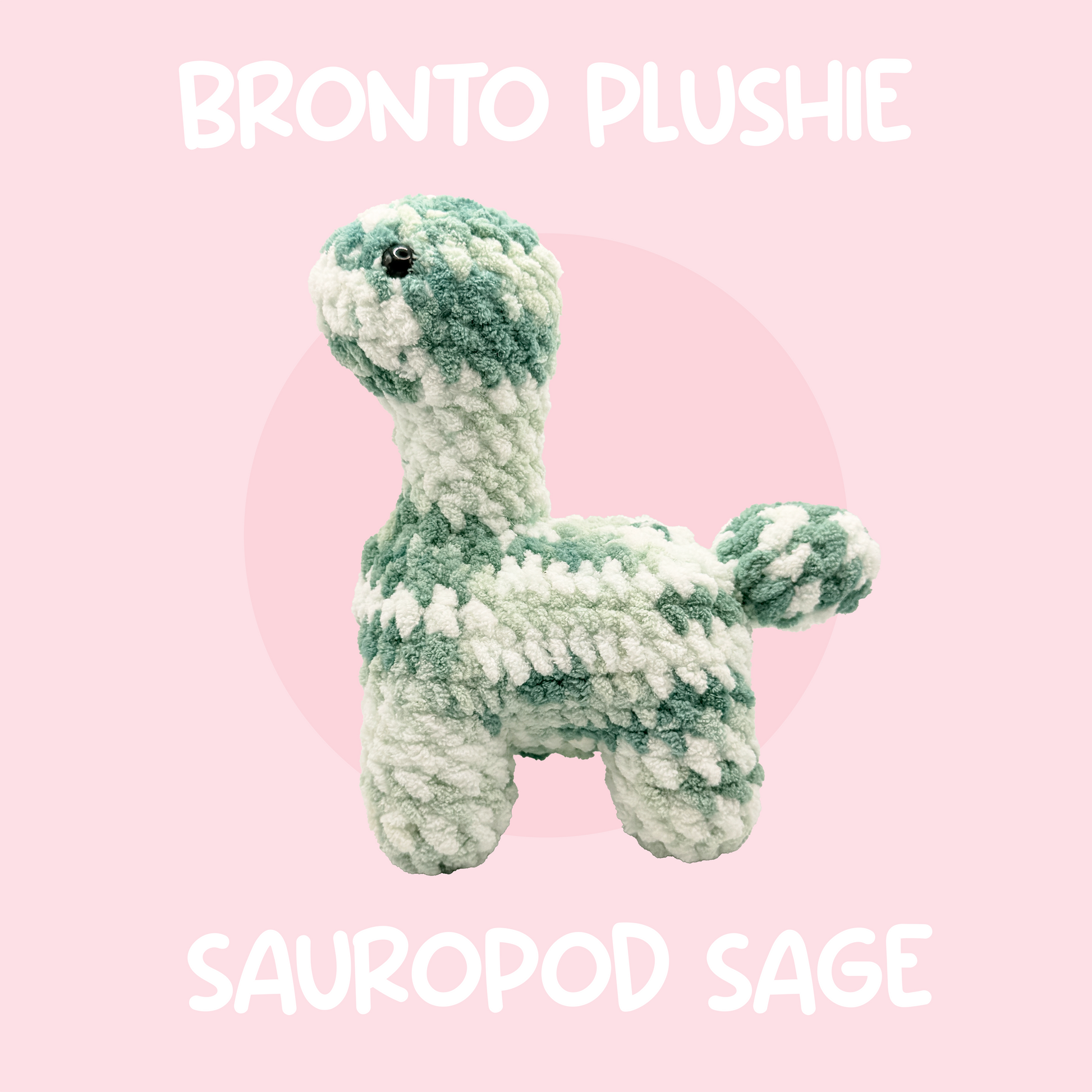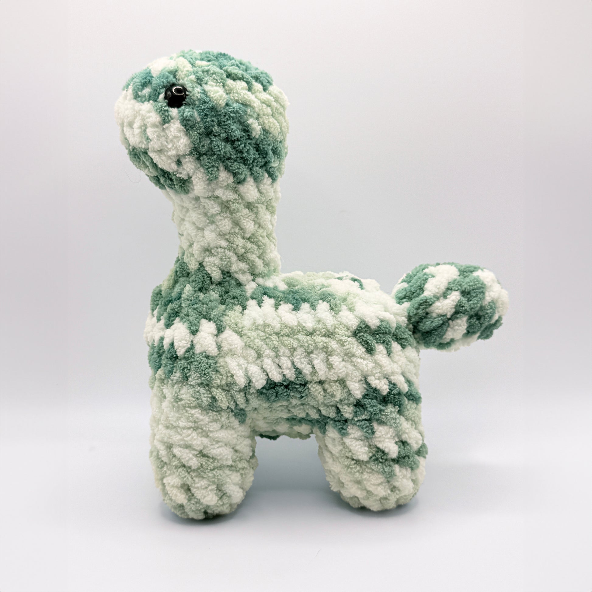 One cute small sauropod sage colored bronto plushie. Crocheted by me!